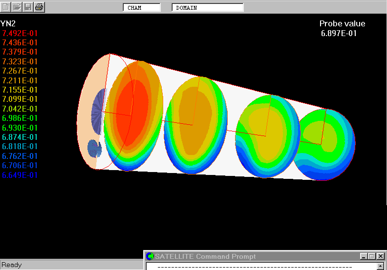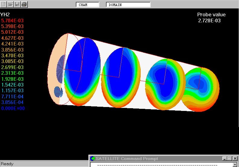 The plots show the flow distribution, mixture composition as represented by the model, gas temperature and velocity within the rotary kiln.