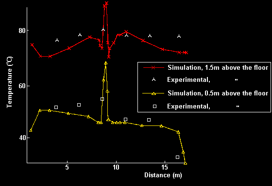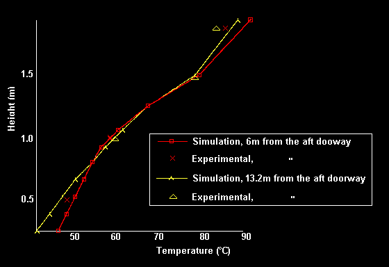 Figure 4. Comparison between numerical and experimental centre-line temperature stratification at two distances from the rear of the cabin.