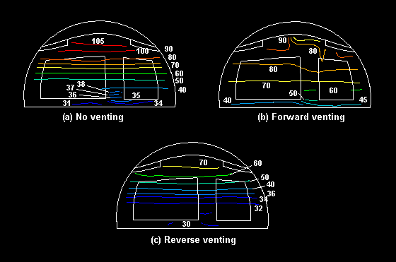 Figure 5. Temperature contours in a cylindrical section located midway between the rear of the cabin and the fire, for the cases (a) without venting, (b) with forward venting and (c) reverse venting.
