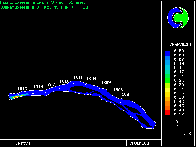 The predicted results are in good agreement with the measurements, although the length of the slick is underpredicted. The time for the slick to arrive at a fixed point downstream was predicted very accurately, ie to the nearest minute for a 90-minute travel time.