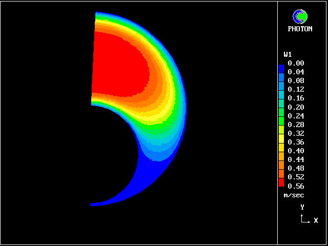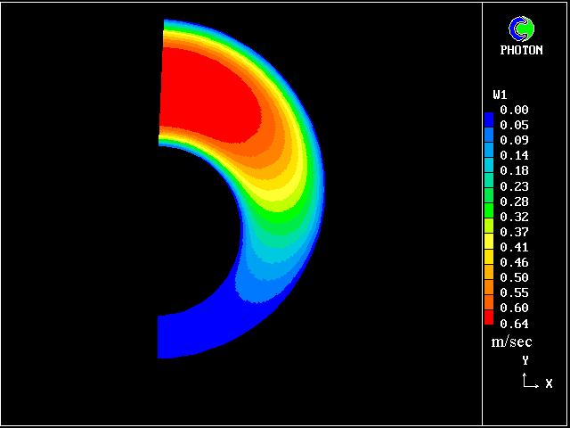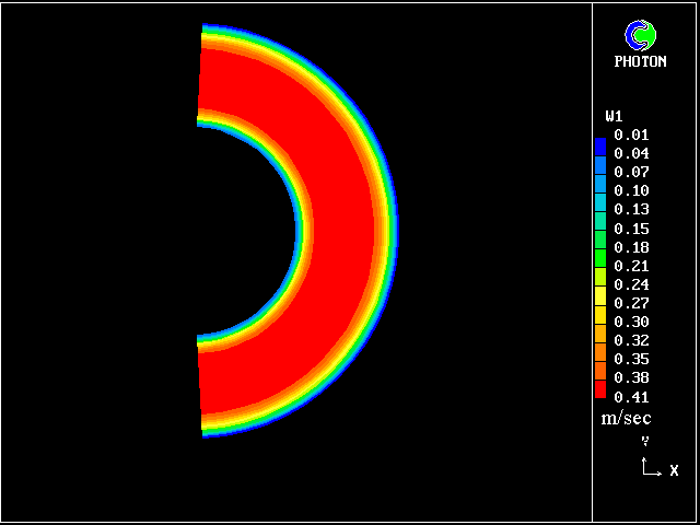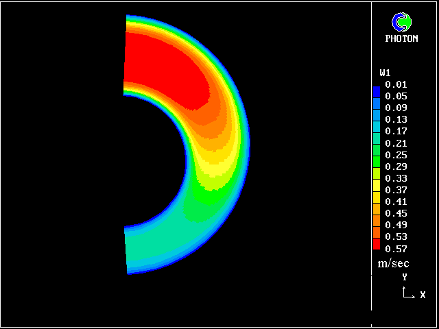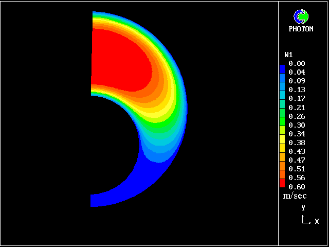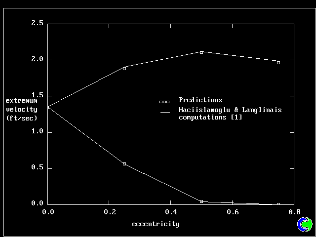 We can notice the effect of increasing eccentricity: The velocity in the narrowing part of the annulus is reduced, while the fluid is rushing into the widening part (fig. 6). For high eccentricities (greater than .5), there is a high velocity plug (flat velocity profile) in the wide part of the annulus, while a no-flow (stagnant) region is created in the narrow part.