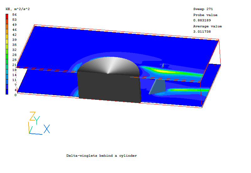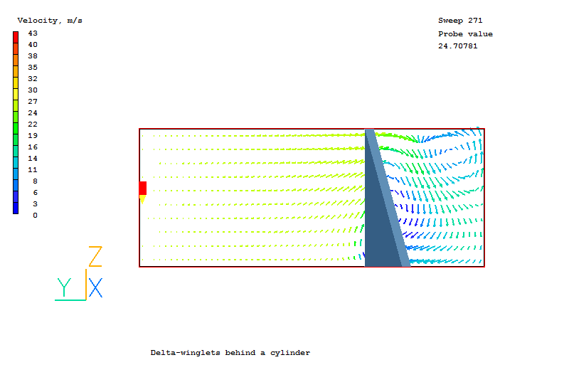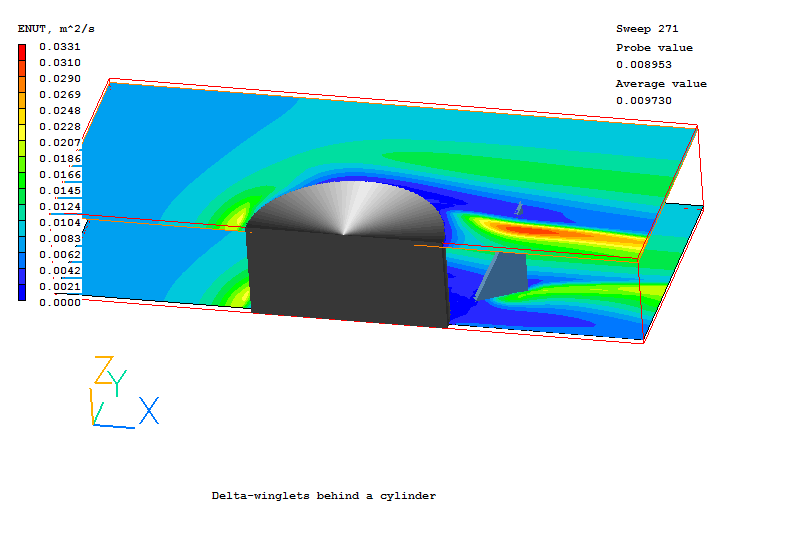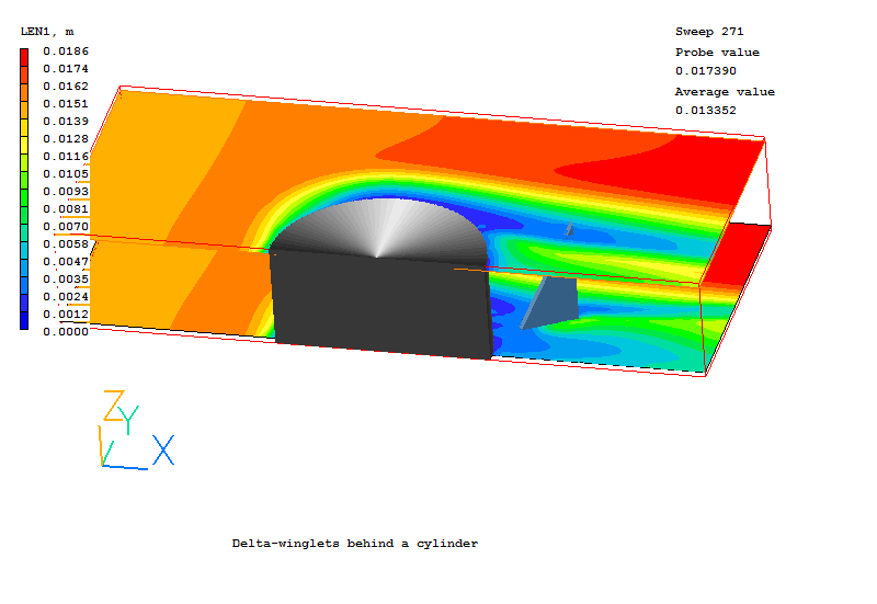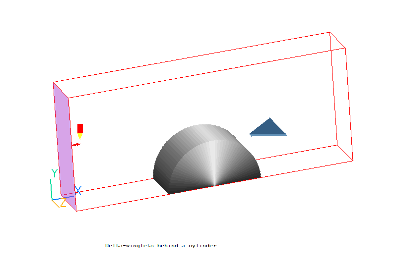 The demonstration case considered consists of a half of cylinder placed in an air flow within a rectangular duct. The delta-winglet is mounted on the wall behind a cylinder. The position of the wingle tip is a half of cylinder diameter relative to the center of cylinder. The right triangle winglet with a hight equal to the duct width has an angle of attack of 45 degree.