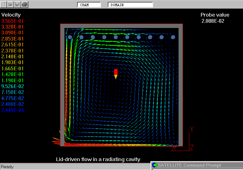 The plots show the distribution of the velocity vectors, temperature and X-, Y-direction radiant heat fluxes within the enclosure.