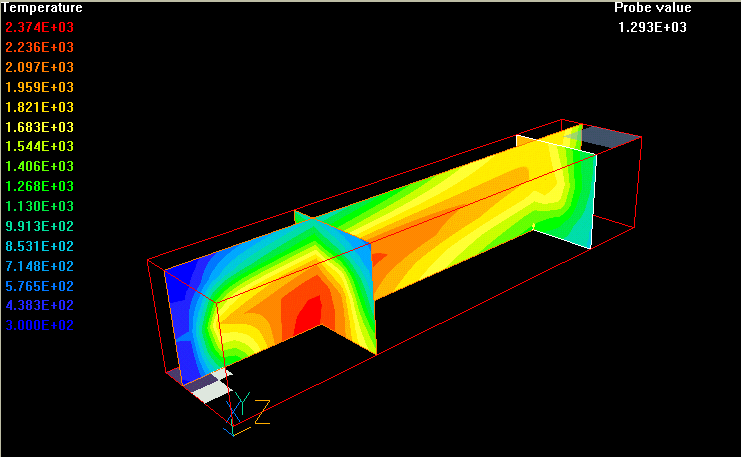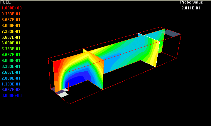 The gases are ignited on the entry and steady state combustion takes place. The combustion products with constant absorption coefficient of 0.4 and constant scattering coefficient of 0.1 flow, in a swirling motion, towards four exhaust openings located at the corners of the top wall.