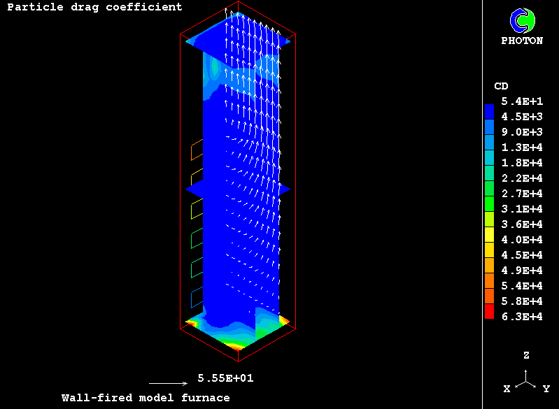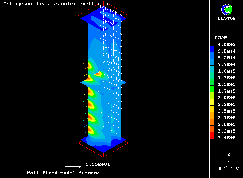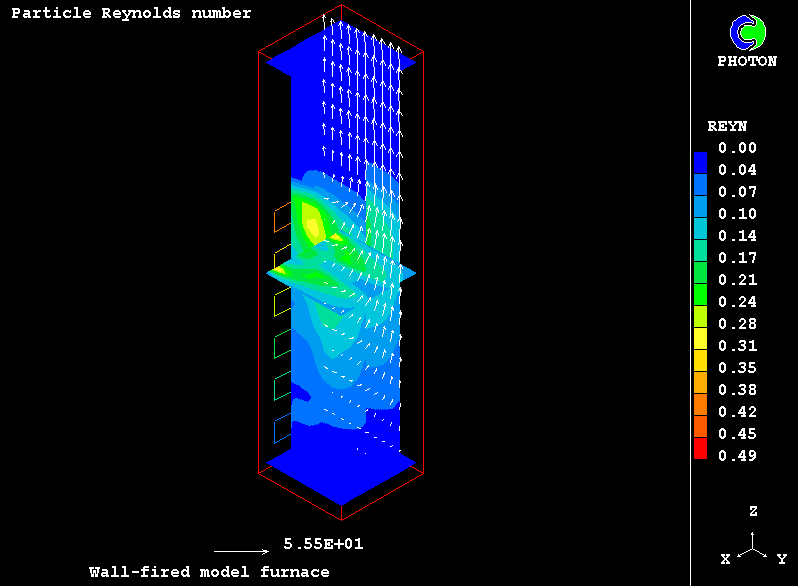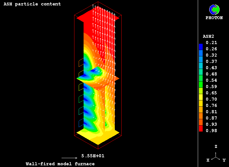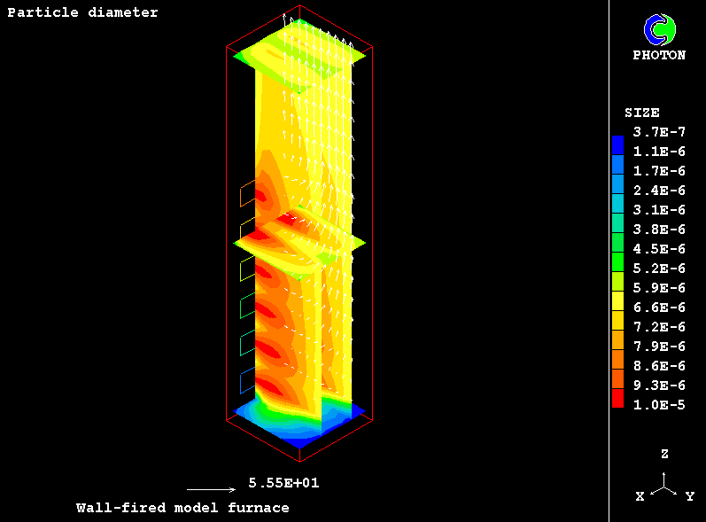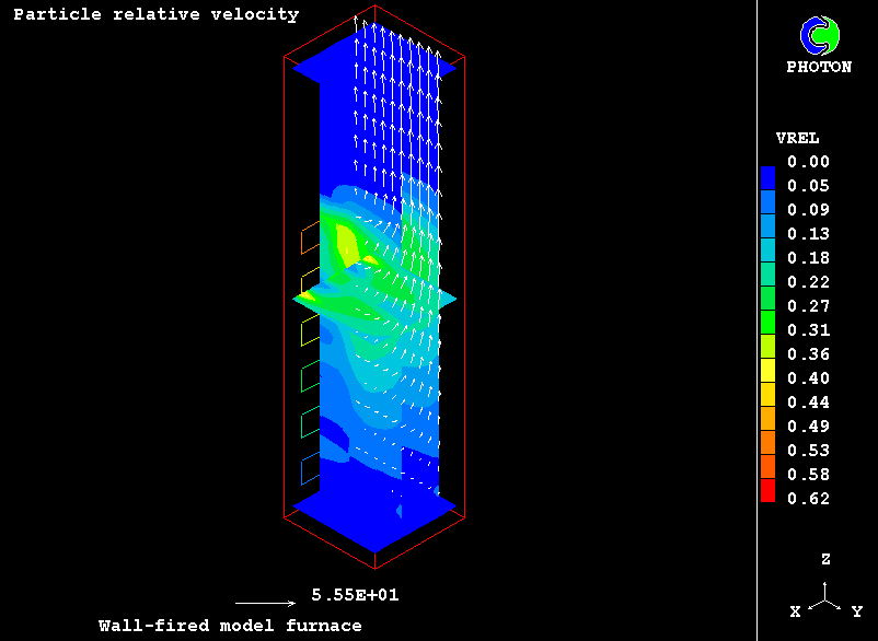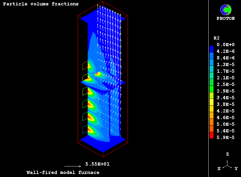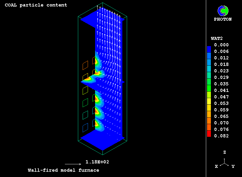 The case presents the implementation in PHOENICS of an IPSA based model for non-equilibrium two-phase reactive flow of combustible particles finely dispersed in the carrying air stream. The model uses the Eulerian description of the two interpenetrating continua with the transfer of heat, mass and momentum between them. The processes accounted for are particle drying, the volatilisation of dispersed phase material, gaseous exothermic oxidation of volatile products, heterogeneuos combustion of particle char and NOx formation.