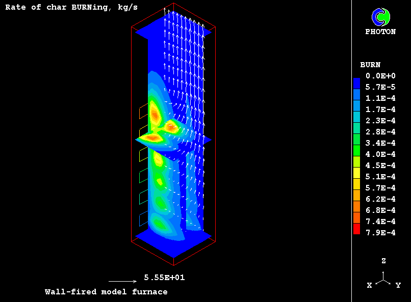 Turbulent combustion of volatiles is modelled via two-step reaction of hydrocarbon oxidation, in which carbon monoxide is an intermediate product.