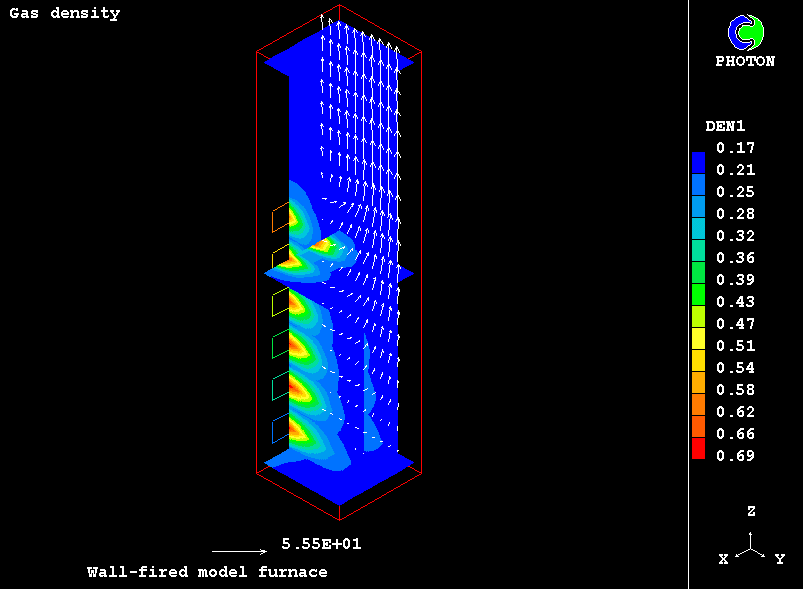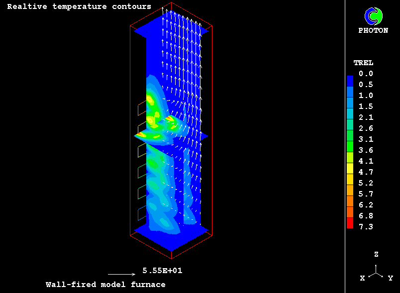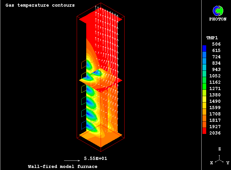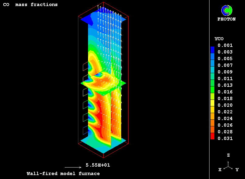 The furnace chamber chosen for the present computations, idealised though, retains many features of real-life industrial equipment: twenty four coal-fired burners are located at the lower part on the furnace front wall; air-pulverised coal particles are injected axially into the combustion chamber; they are ignited; steady state combustion takes place; combustion products flow towards the outlet at the upper part of the chamber.