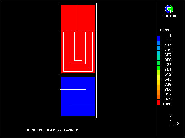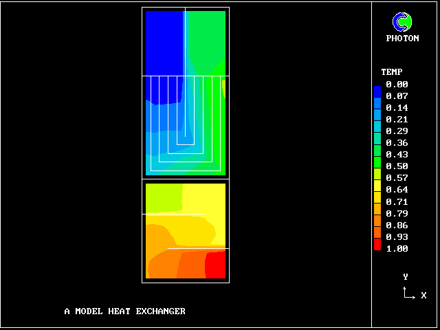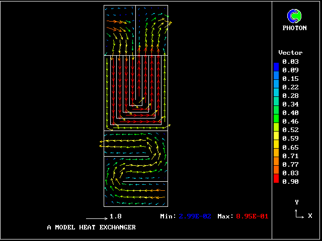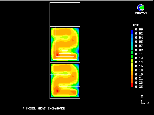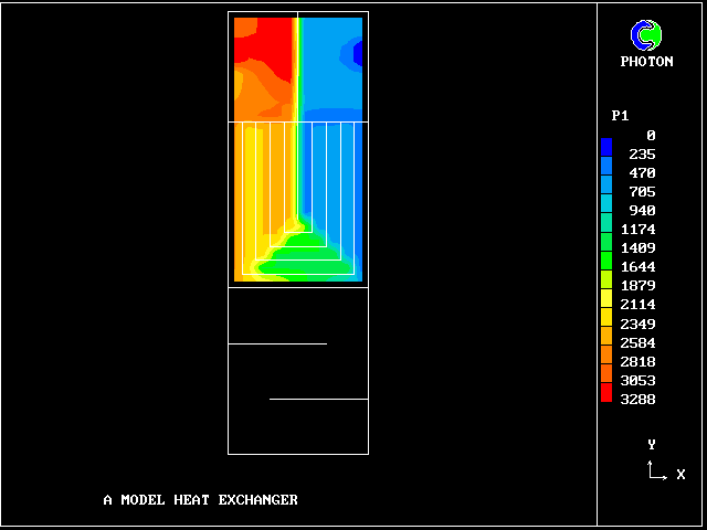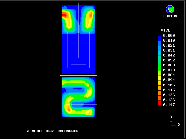 A series of PHOTON plots describe the fluid movements and temperature distribution in model heat exchanger.